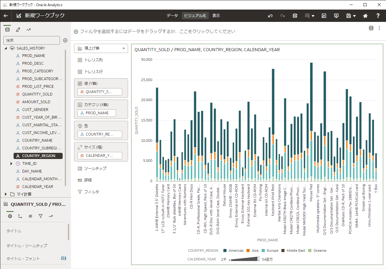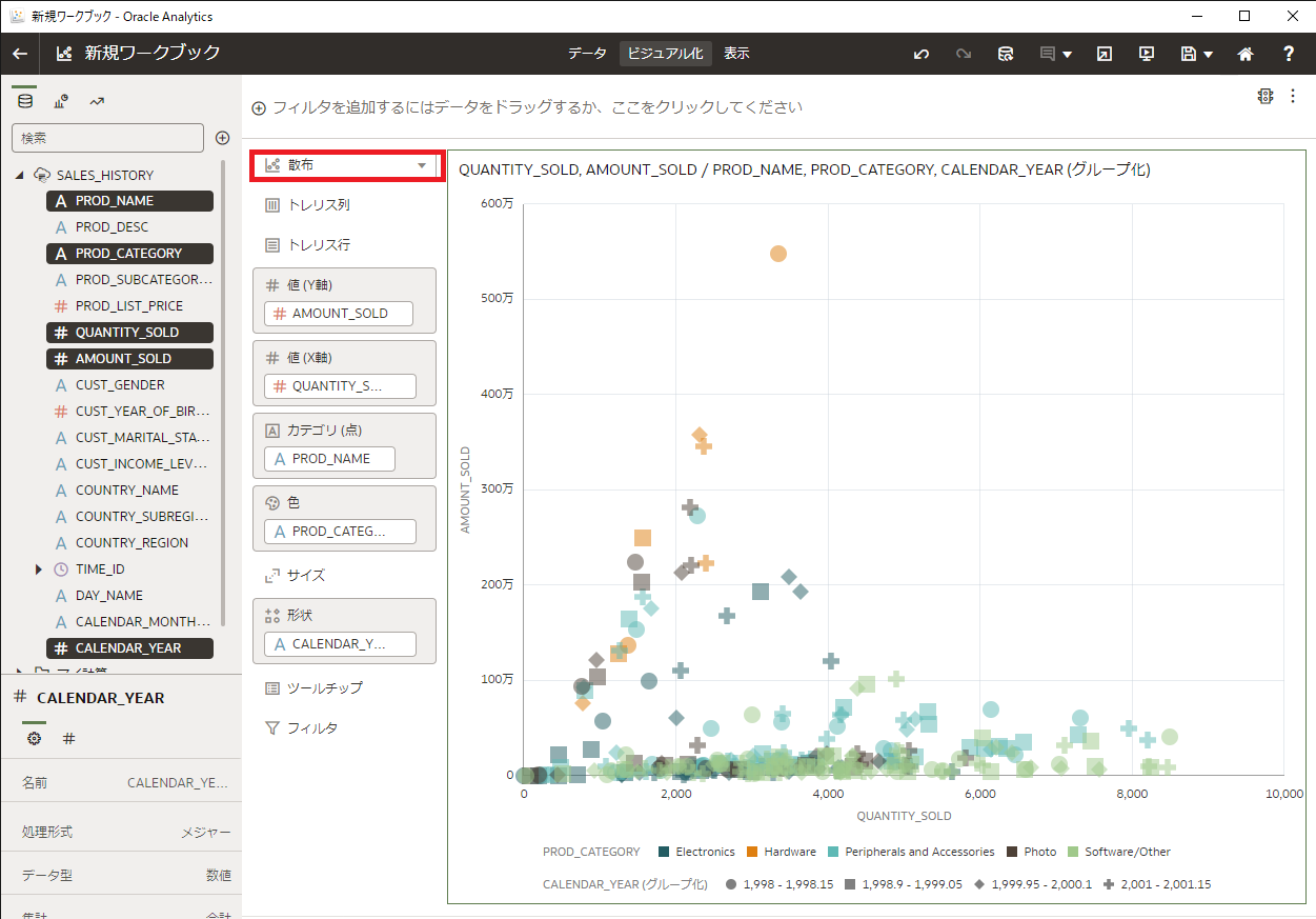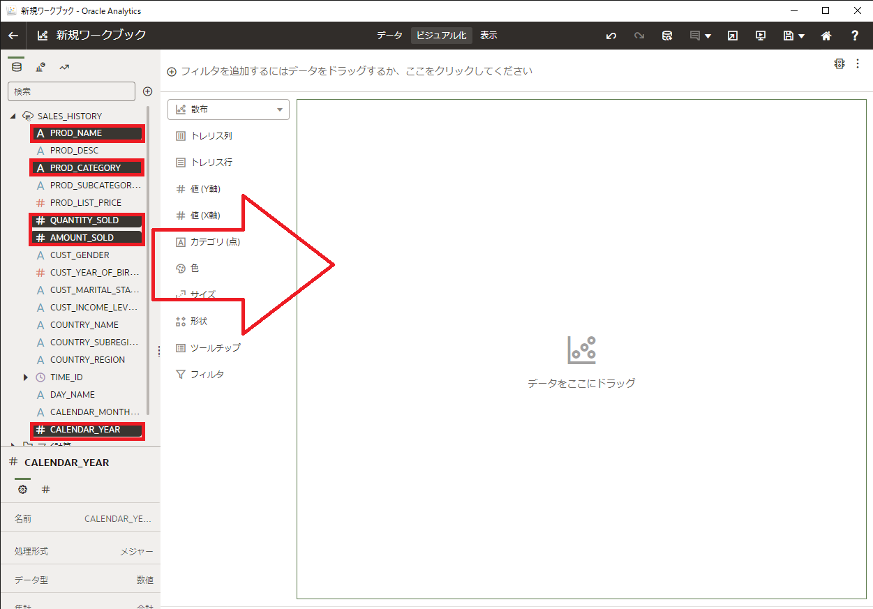 新規ワークブック画面に変わり、左に SALES_HISTORYビュー の列情報が表示されるので、SALES_HISTORYビュー内の5つのデータ要素( PROD_NAME、PROD_CATEGORY、QUANTITY_SOLD、AMOUNT_SOLD、CALENDAR_YEAR)を複数選択(Ctrlキーを押しながらクリック)し、画面の右側にドラッグ&ドロップします。