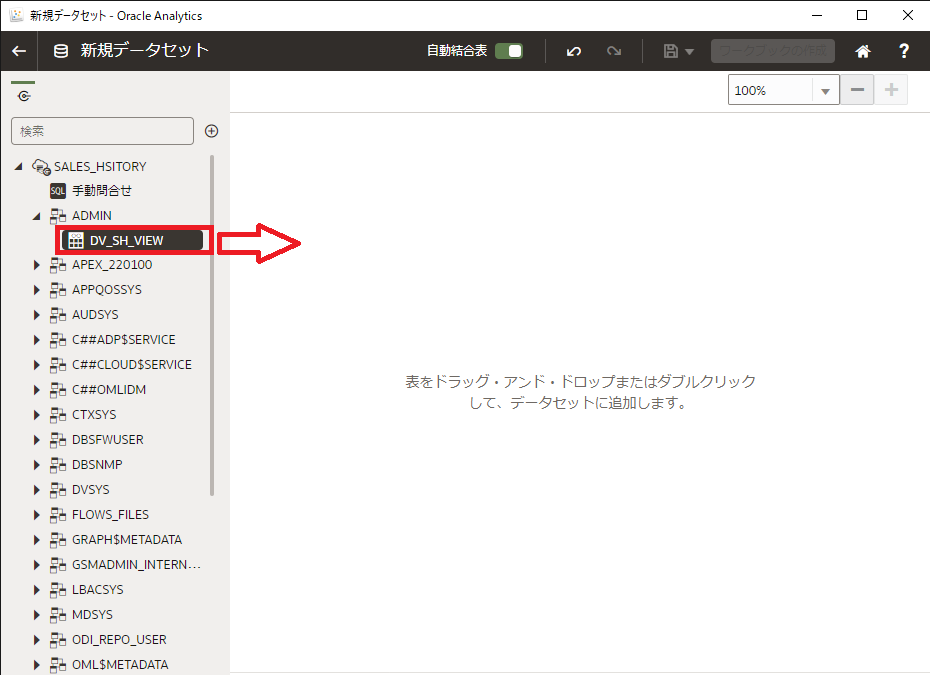新規データセットの画面で、左のスキーマ一覧から、ADMIN スキーマを展開し、DV_SH_VIEW を右の画面にドラッグ&ドロップ、または、ダブルクリックで、右側に追加します。