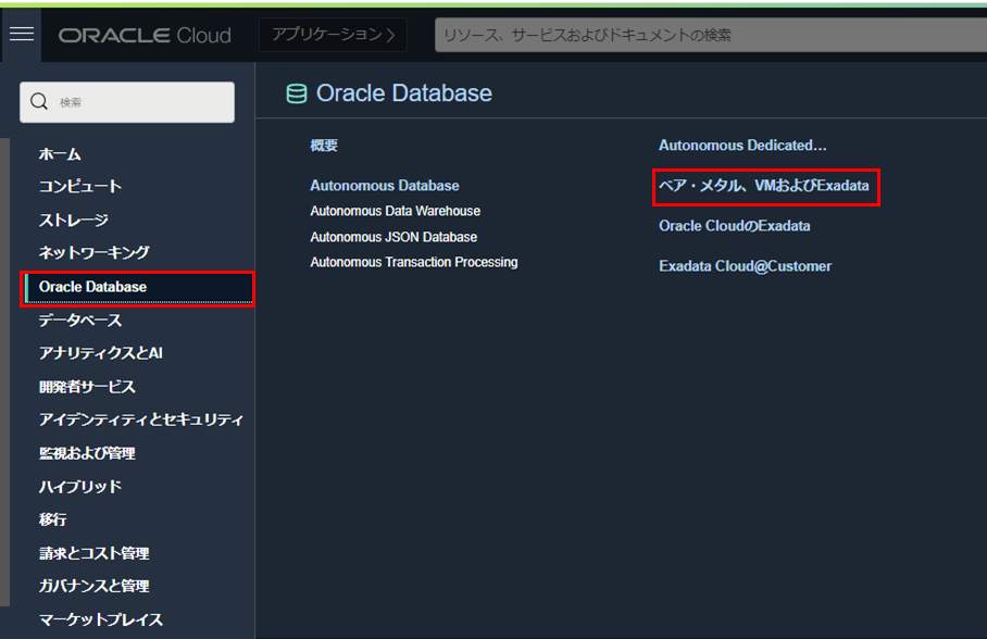 OCIコンソール・メニューから Oracle Database → ベア・メタル、VMおよびExadata を選択します。