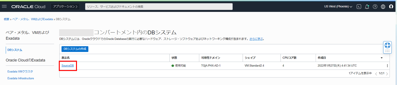 ソース・データベース(前提条件で作成したBaseDB)のDBシステム名をクリックします。