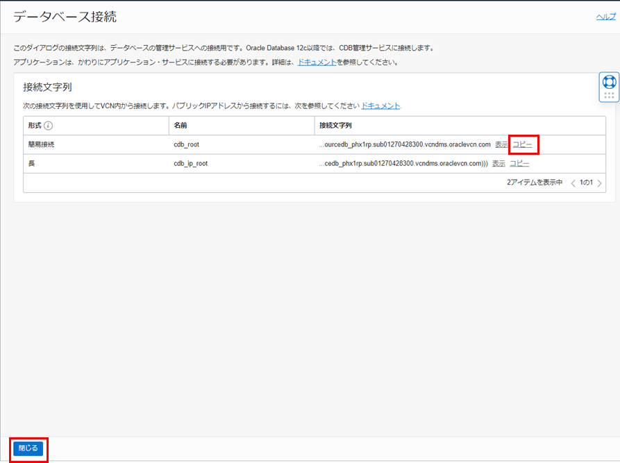 - 接続文字列 - 本チュートリアルの2-1.ソース・データベースのCDBとPDBの接続情報の確認の10.でメモ帳にコピーした接続文字列のホスト名部分をデータベース・ノードのプライベートIPアドレスと入れ替えて入力します。例:10.0.0.28:1521/pdb.sub01270428300.vcndms.oraclevcn.com