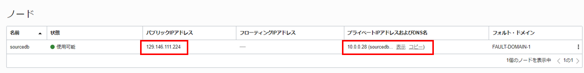 ソース・データベースのパブリックIPアドレス と プライベートIPアドレス をそれぞれコピーし、メモ帳に貼り付けます。(後の手順で使用するため)