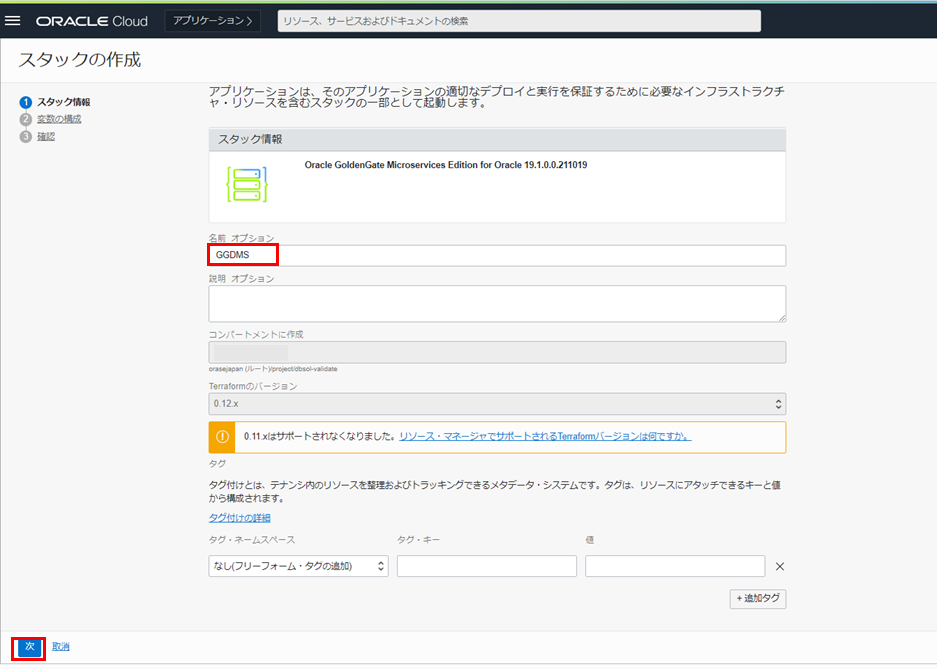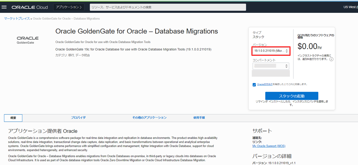 任意の バージョン と コンパートメント を選択し、Oracle使用条件を確認した上でこれに同意します。 にチェックを付け、スタックの起動 をクリックします。