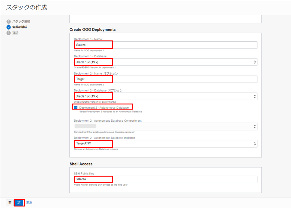 /home/opc/ogg-credentials.jsonを参照) - GoldenGateデプロイメント名 - 1. Oracle GoldenGate Microservicesのインストールの5.で設定したソース・データベースのデプロイメント名