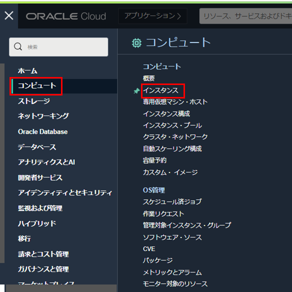 OCIコンソール・メニューから コンピュート → インスタンス に移動します。