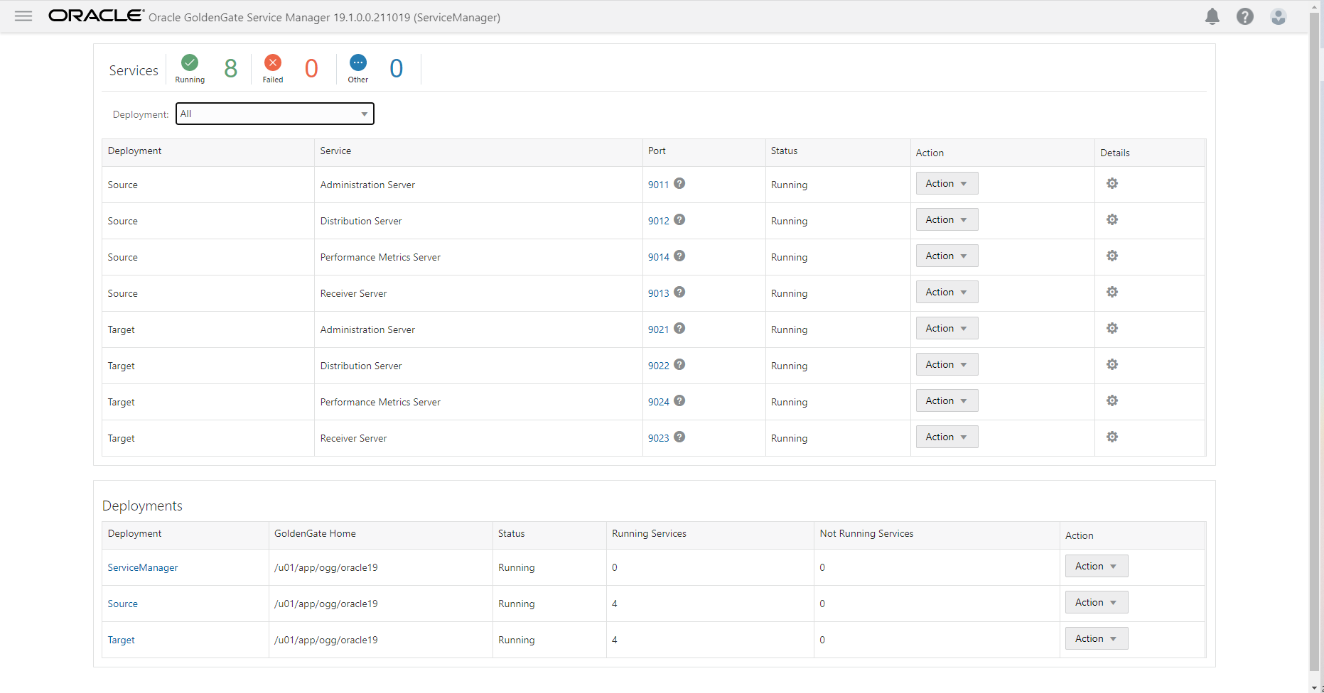Services の一覧にあるソース・データベースの Deployment の Administration Server の Port 番号をクリックします。