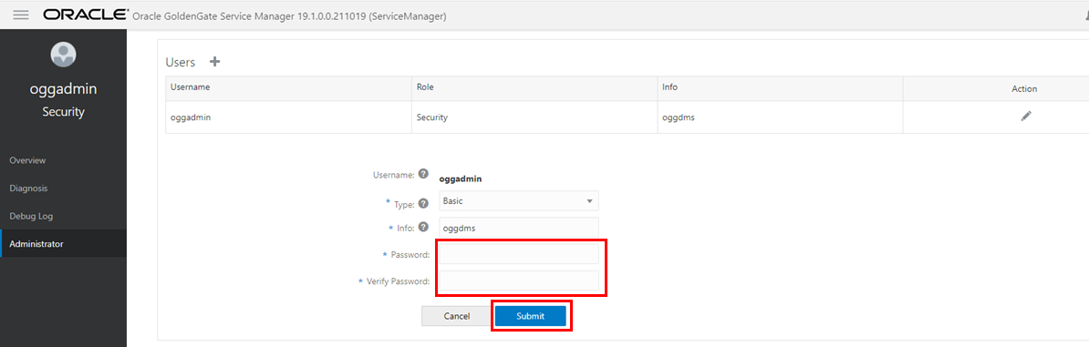 Oracle GoldenGate Service Manager に戻り、11.~16.と同様の手順でターゲット・データベースの Deployment のAdministration Serverのパスワードを変更します。