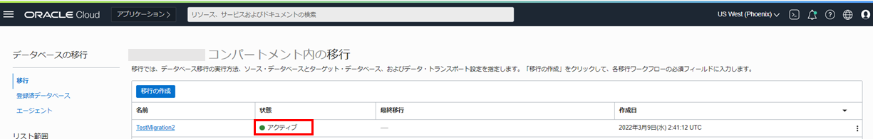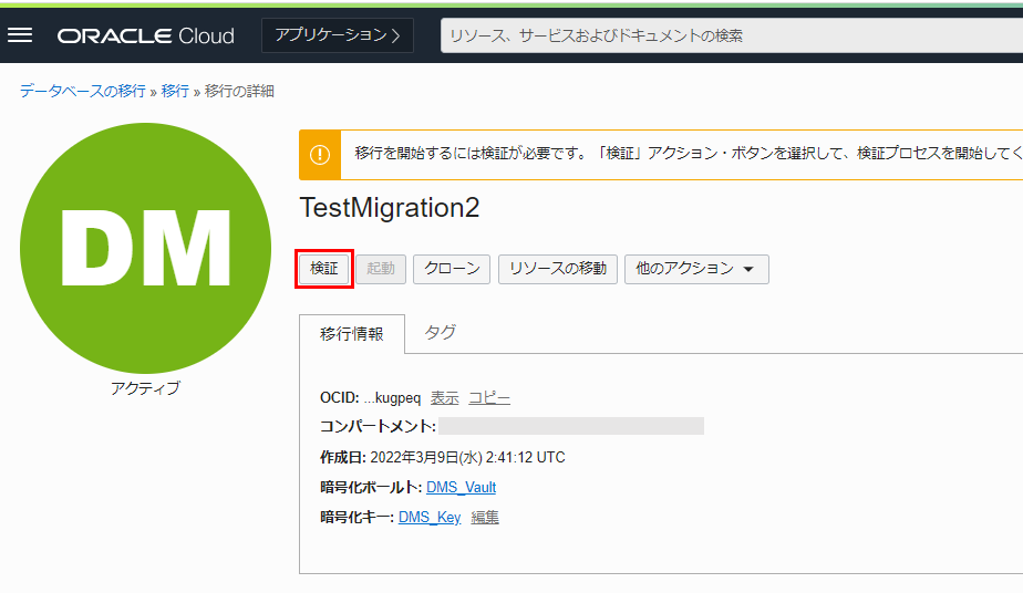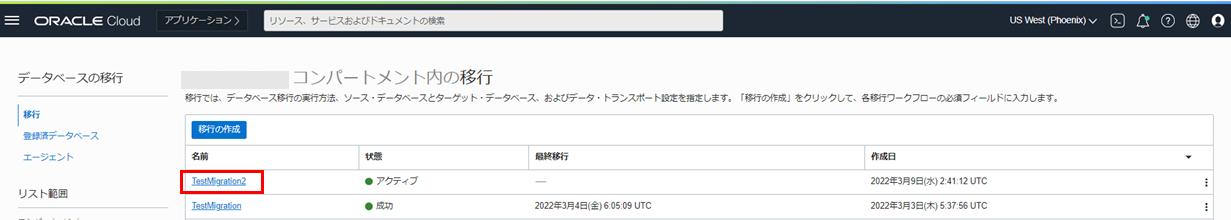 検証する移行の名前をクリックします。(5. 移行の作成で作成した移行)