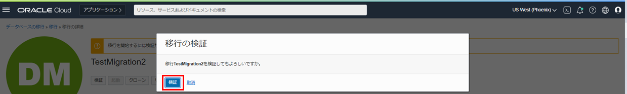 検証 ボタンをクリックすると 移行の検証 ダイアログが表示されます。 検証 をクリックします。