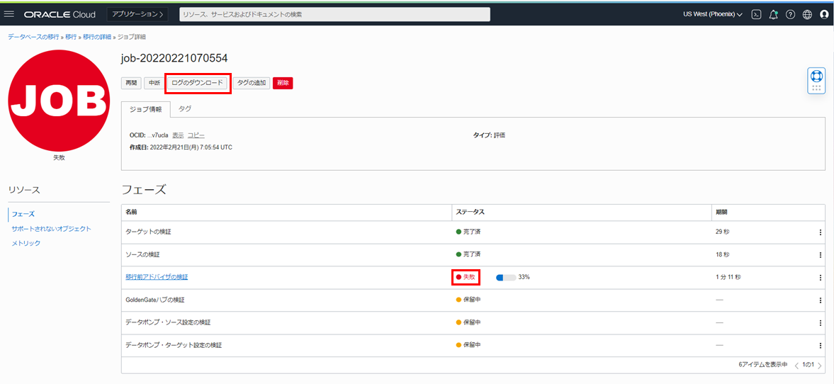 検証が失敗した場合、フェーズ の ステータス に失敗 と表示されます。その場合、 ログのダウンロード ボタンをクリックしてログを参照することで、失敗の詳細を確認することができます。もう一度実行したい場合は、 中断 ボタンをクリックして検証を再度やり直してください。