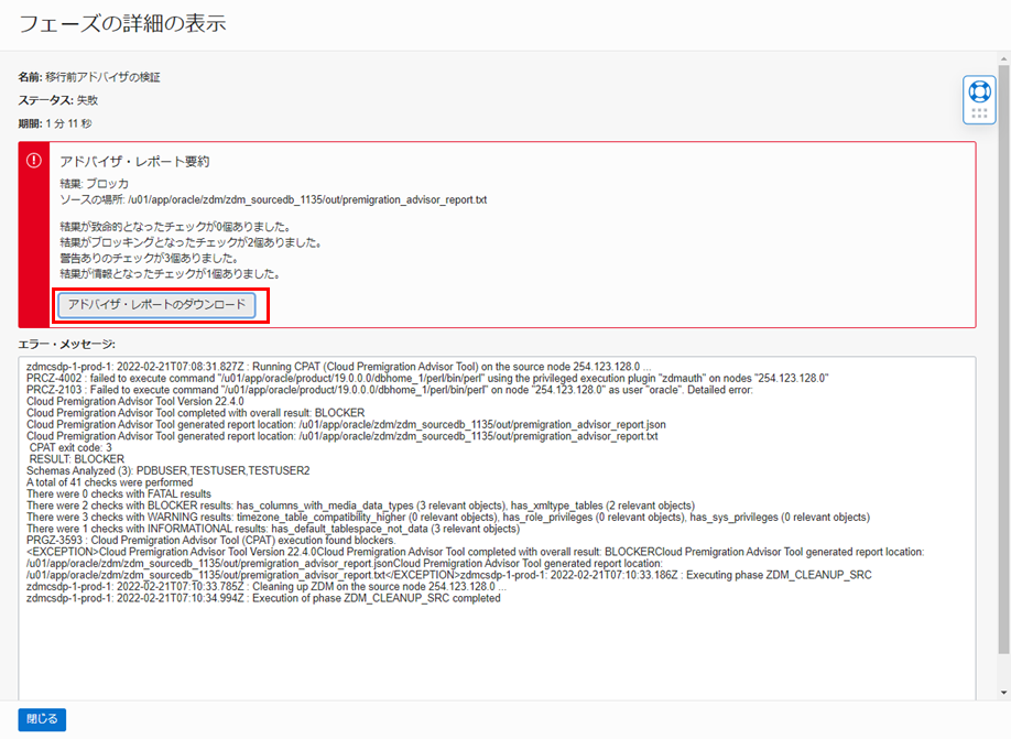 移行前アドバイザの検証 で失敗した場合、フェーズ の 移行前アドバイザの検証 をクリックし、アドバイザ・レポートのダウンロード をクリックすることでCPAT (Cloud Premigration Advisor Tool)の結果を閲覧することができます。