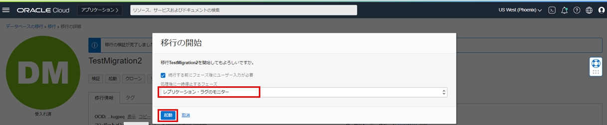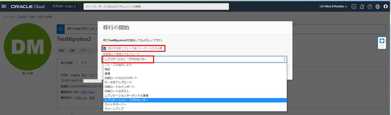 移行の開始 ダイアログが表示されます。続行する前にフェーズ後にユーザー入力が必要 にチェックを付けると、選択したフェーズの後に一時停止をするように設定できます。チェックを付けて、レプリケーション・ラグのモニター を選択します。