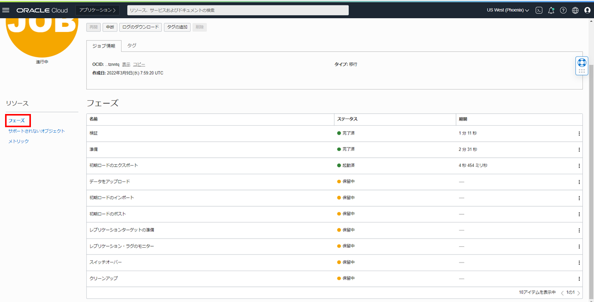 リソース の一覧にある フェーズ をクリックします。ここで実行中の移行のフェーズが確認できます。