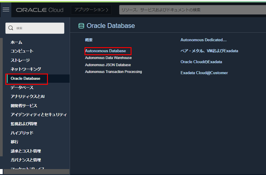 OCIコンソール・メニューから Oracle Database → Autonomous Database に移動します。