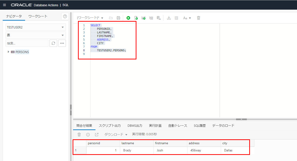 DMSのオブジェクト・ストレージとデータ・ポンプを使用した移行メソッドによって、3. ソース・データベースの設定の6.で作成したサンプル・データがターゲットADBに移行されていることが確認できました。