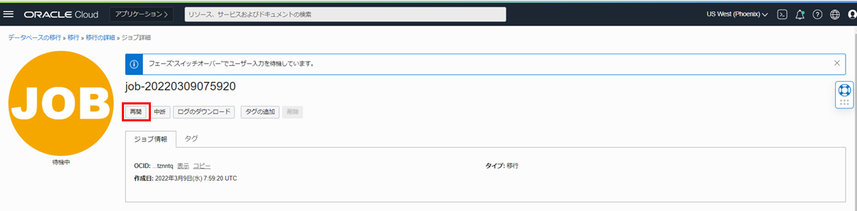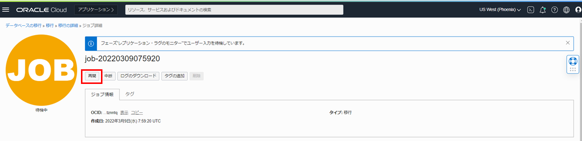 一時停止中のジョブの ジョブ詳細 ページに戻り、再開 ボタンをクリックします。