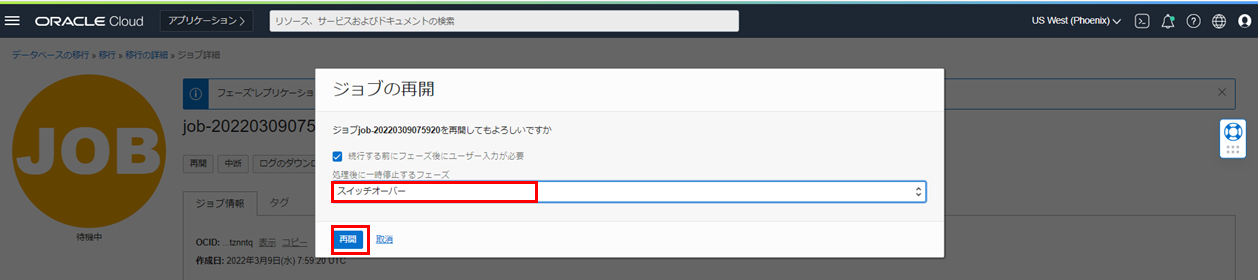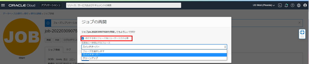 ジョブの再開 ダイアログが表示されます。続行する前にフェーズ後にユーザー入力が必要 にチェックを付けると、選択したフェーズの後に一時停止をするように設定できます。チェックを付けて、スイッチオーバー を選択します。選択後、再開 をクリックします。