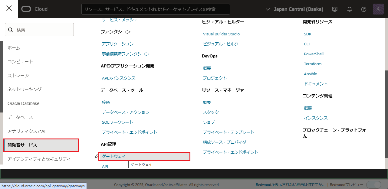 OCIコンソールのハンバーガーメニューをクリックして、「開発者サービス」に移動して、「ファンクション」をクリックします。