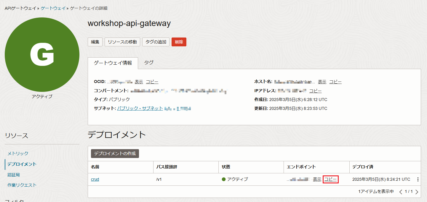 APIデプロイメントのリストで、作成したばかりの新しいAPIデプロイメントのエンドポイントの横にある[コピー]をクリックして、エンドポイントをコピーします。