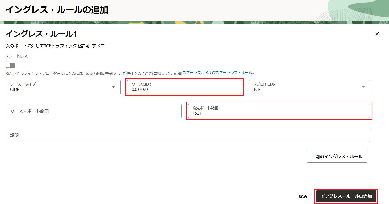 OCI API Gateway を利用する上で、443 ポートも使用します。ポート1521と同じ手順で443ポートのトラフィックを許可するイングレス・ルールを同じサブネットに追加してください。