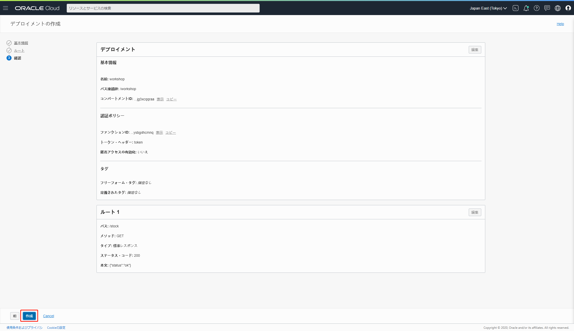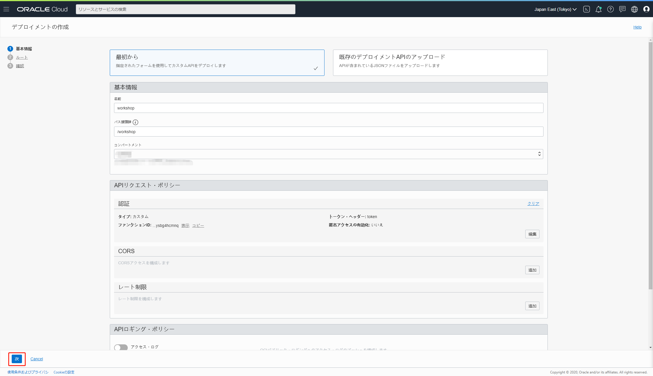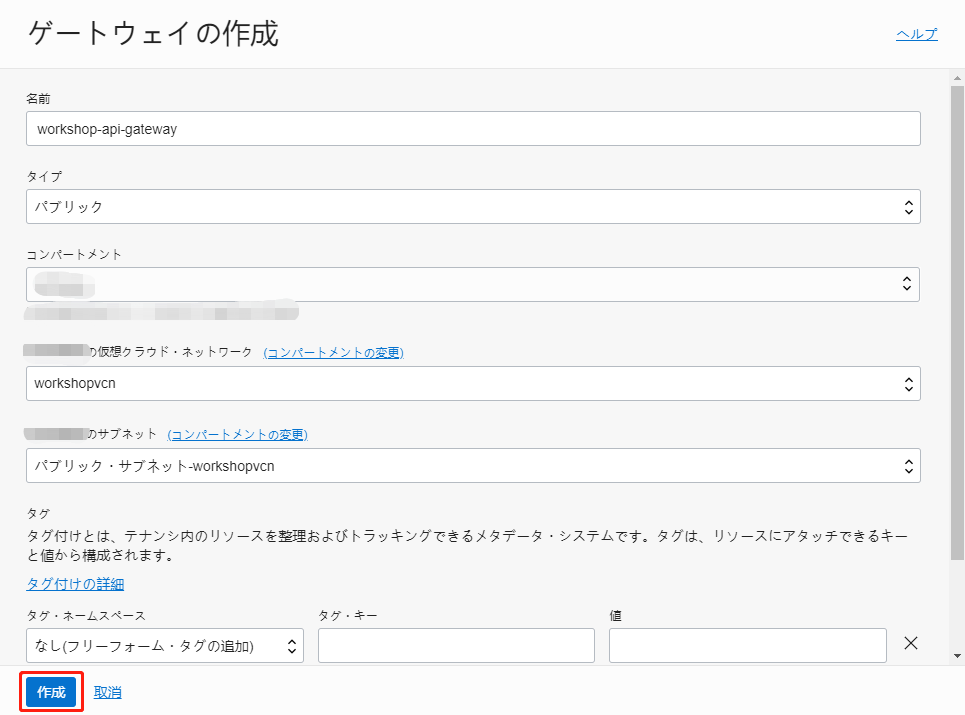 コンパートメント:OCI API Gatewayリソースを作成するコンパートメントの名前(こちらのワークショップではFunctionと同じコンパートメントを指定してください)