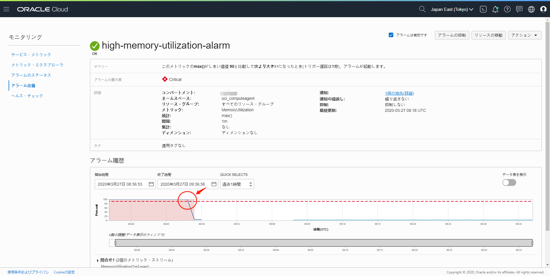 このステップでは、OCIコンソールを使用してアラームを作成していきます。