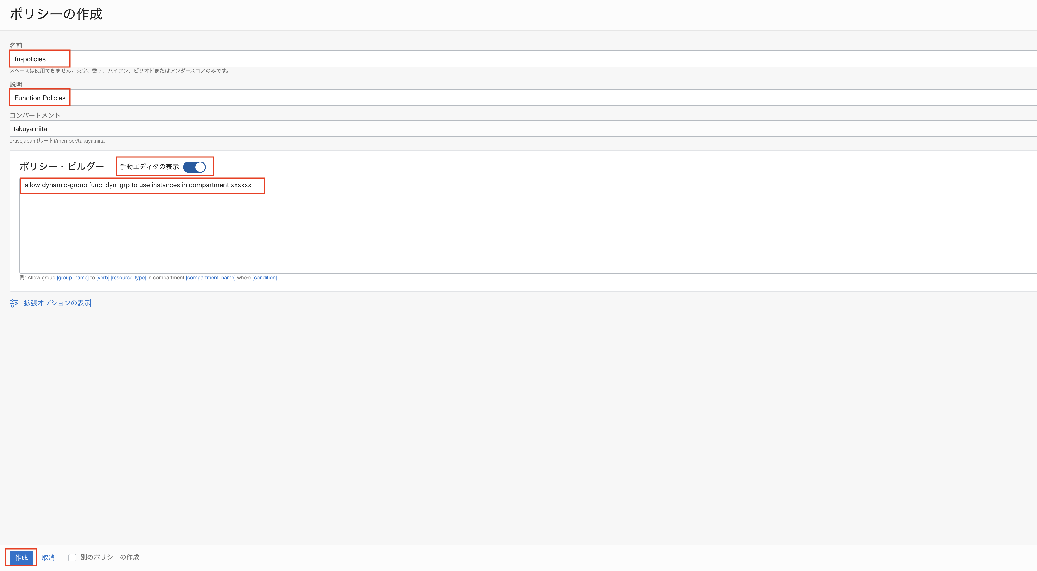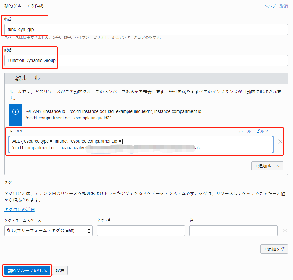 ALL {resource.type = 'fnfunc', resource.compartment.id = '<compartment-ocid>'}(compartment.idは各自で使用するコンパートメントOCIDへ変更してください。)