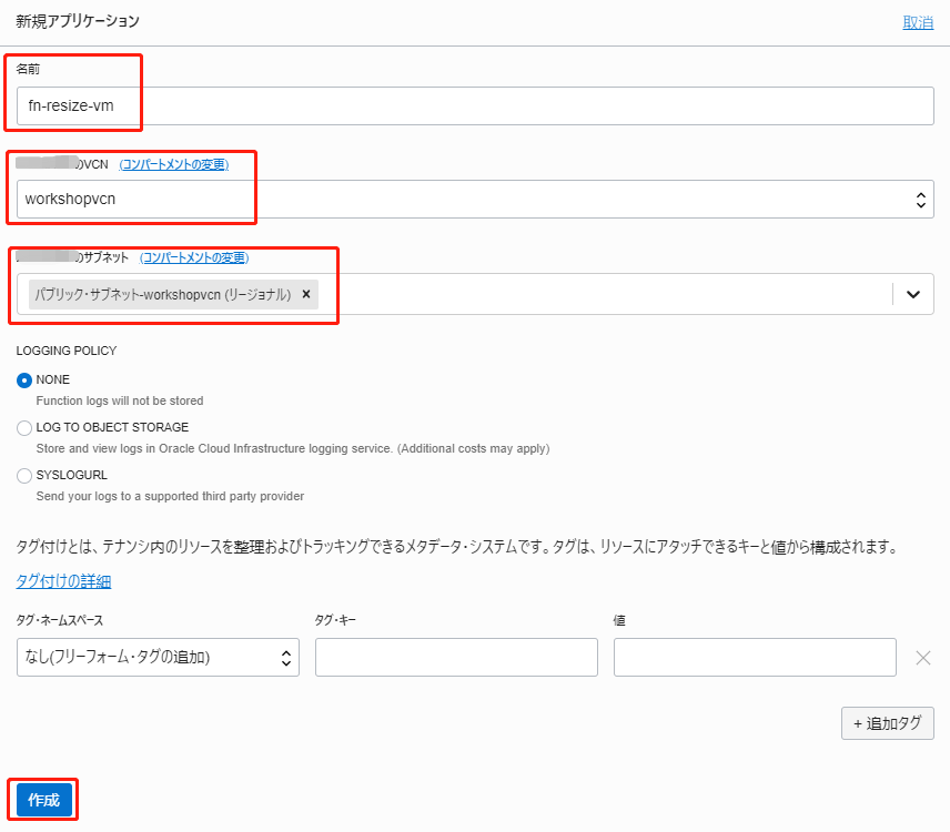 - サブネット:Functionを実行するサブネット。今回は、Oracle Functionsことはじめで作成したVCNのサブネットを指定。