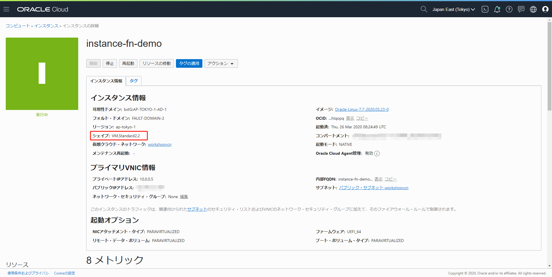 現在VMのシェイプを確認します。シェイプはVM.Standard2.1になっています。