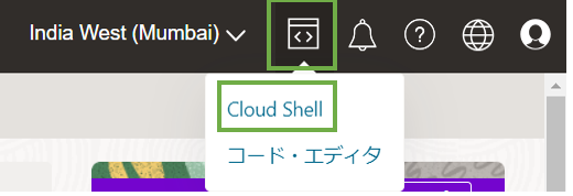 ここからは、Cloud Shellを使って操作を行います。Cloud Shellは、OCIコンソール画面の右上のアイコンを選択し、「Cloud Shell」を選択します。