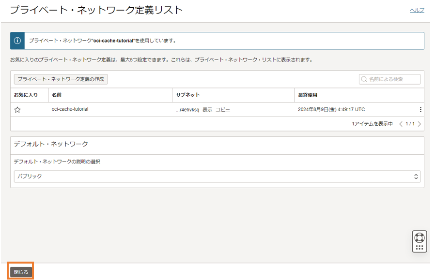 画面上部に「プライベート・ネットワーク"oci-cache-tutorial"を使用しています」と表示されていれば、「閉じる」を選択します。表示されていない場合(「アクティブなネットワークとして使用」にチェックを入れなかった場合表示されません)、作成したプライベート・ネットワーク定義のケバブメニューから、「アクティブなネットワークとして使用」を選択してアクティブにします。