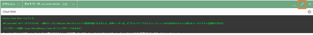 Cloud ShellをOCI Cacheと同じVCNに配置するための設定を行います。Cloud Shellの上部にある、「ネットワーク:パブリック」を選択します。