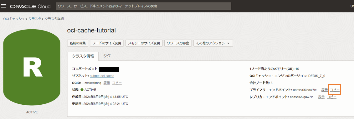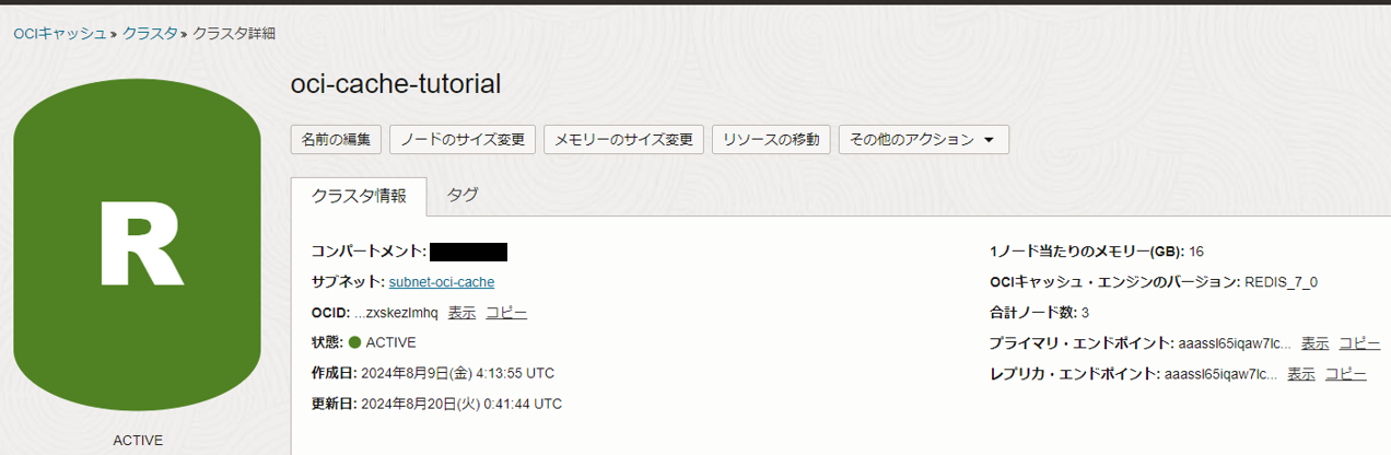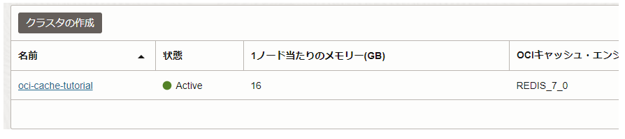 状態がActiveとなれば作成完了です。oci-cache-tutorialをクリックし、クラスタの詳細ページに移動しておきます。