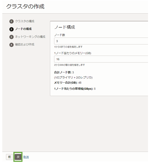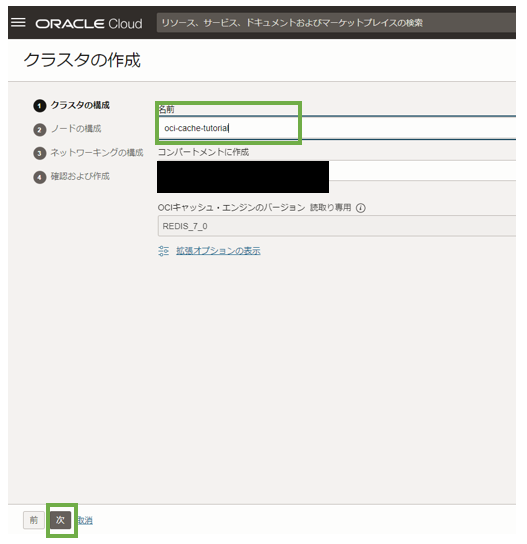 クラスタの構成ページでは、名前を編集します。任意の名前で問題ありませんが、ここではoci-cache-tutorialとします。名前の編集が完了したら、「次」を選択します。
