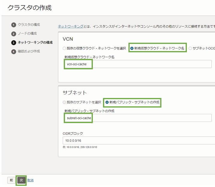 ネットワーキングの構成が表示されます。VCNの設定欄では、「新規仮想クラウド・ネットワーク名」を選択し、新規仮想クラウド・ネットワーク名を入力します。この名前は任意の名前で問題ありませんが、ここではvcn-oci-cacheとします。
