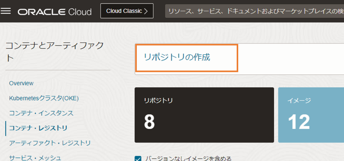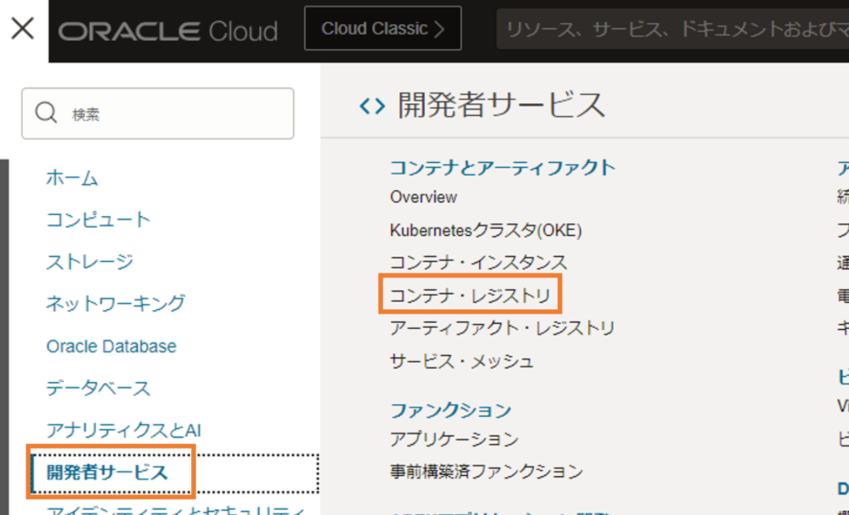 次に、OCI Functionsにデプロイするアプリケーションのコンテナイメージを格納するための、コンテナリポジトリの作成を行います。画面左上のハンバーガーメニューから、「開発者サービス」を選択し、「コンテナ・レジストリ」を選択します。