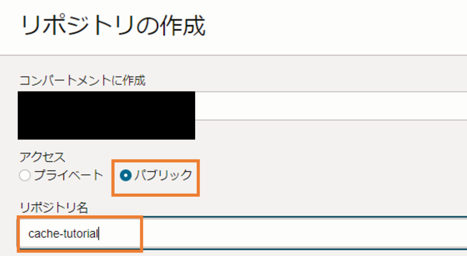 リポジトリの作成ページが開いたら、「アクセス」を「パブリック」にし、「リポジトリ名」をcache-tutorialとします。