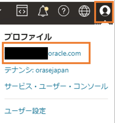 OCIRにアクセスするには、ユーザー名とパスワードが必要になります。OCIRではパスワードに認証トークンを利用しますので、認証トークンを作成しておきます。画面右上のユーザーアイコンを選択し、ご自身のプロフィール名を選択します。