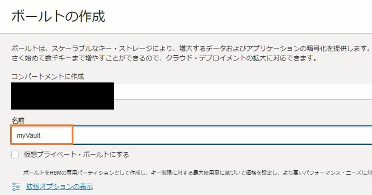 ボールトの作成ページが開いたら、任意の名前を入力します。ここではmyVaultとします。名前を入力したら、Vaultを作成します。