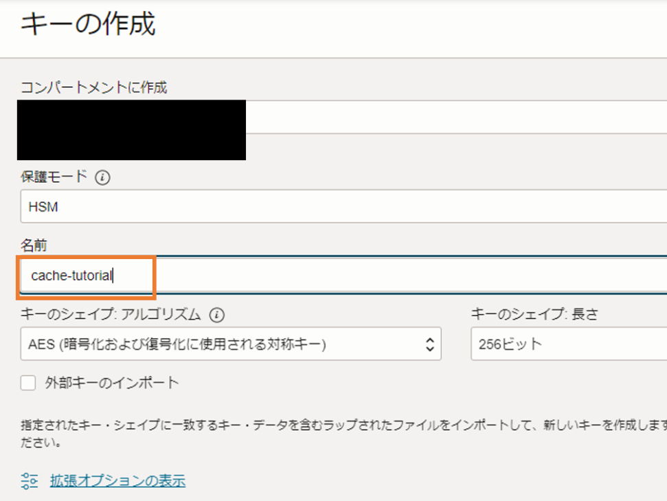 キーの作成ページが開いたら、名前を入力します。ここではcache-tutorialとします。