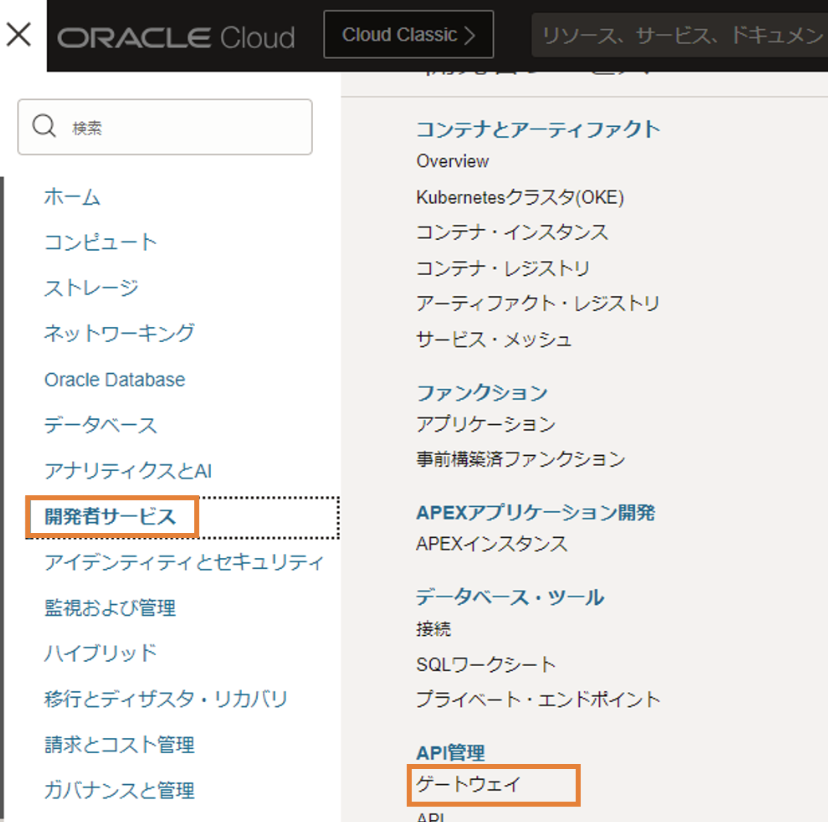 最後に、API Gatewayの作成を行います。画面左上のハンバーガーメニューから、「開発者サービス」を選択し、「API管理」の「ゲートウェイ」を選択します。