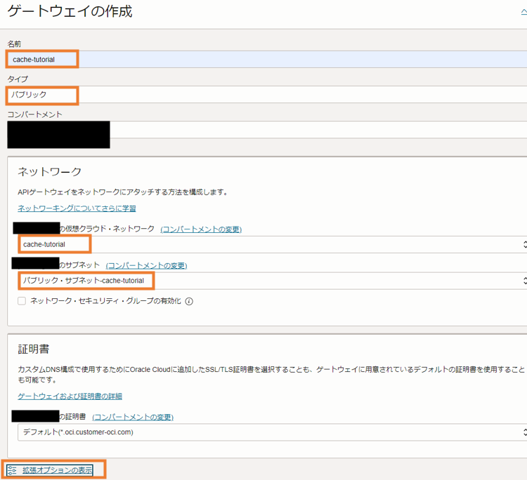 VCN名だけ任意の名前を入力して、後はデフォルトのまま作成します。ここではVCN名をcache-tutorialとします。