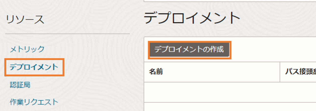次に、デプロイメントを作成します。画面左下のリソース一覧から、「デプロイメント」を選択し、「デプロイメントの作成」を選択します。