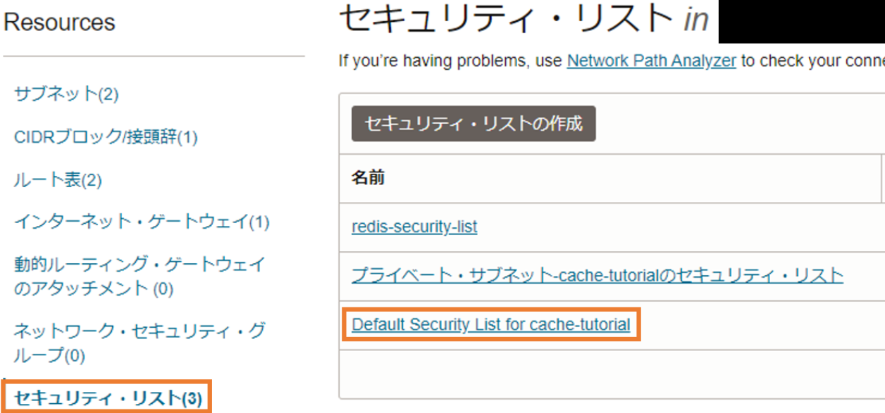 VCNの作成が完了したら、作成したVCNの詳細ページの左下にある、セキュリティ・リストを選択し、「Default Security List for xxx」を選択します。