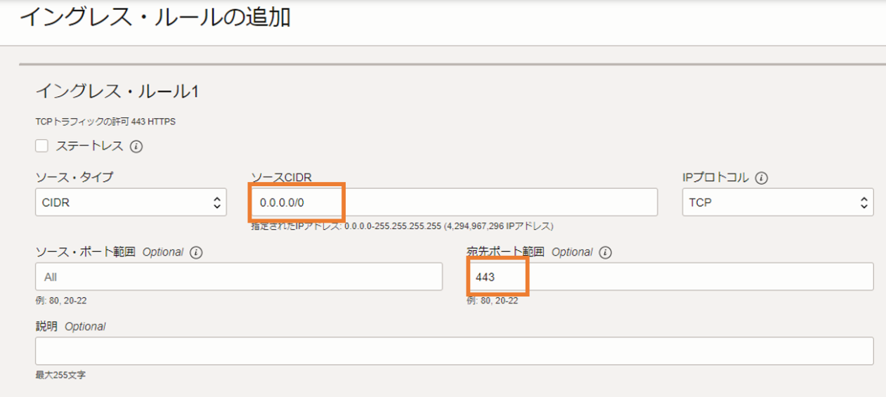 本チュートリアルではHTTPS通信を行うため、ポート443の通信を許可します。ソースCIDRにはすべてのIPを許可するために0.0.0.0/0を入力し、宛先ポート範囲は443とします。これらを入力したら、「イングレス・ルールの追加」を選択します。