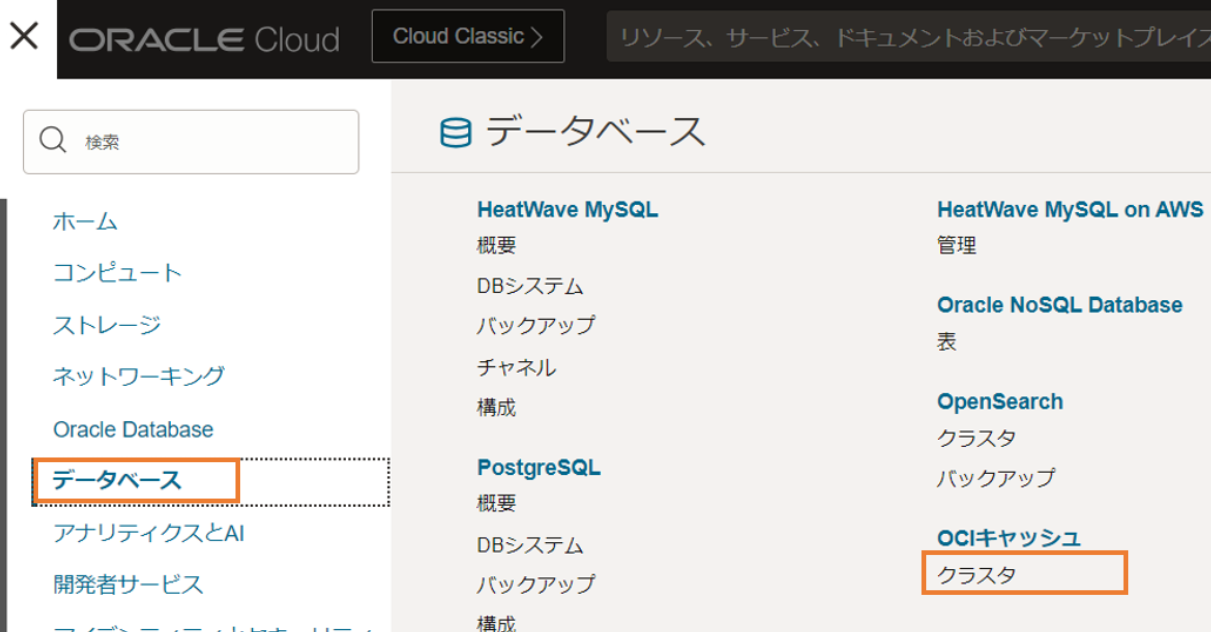 次に、OCI Cacheを作成します。画面左上のハンバーガーメニューから、「データベース」を選択し、「OCIキャッシュ」の中の「クラスタ」を選択します。