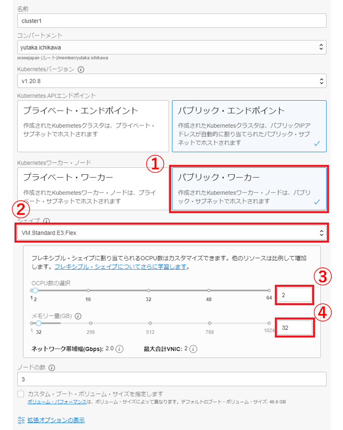 「Kubernetesワーカー・ノード」:「パブリック・ワーカー」 「シェイプ」:「VM Standard.E3.Flex」 「OCPU数の選択」:「2」 「メモリー量(GB)」:「32」