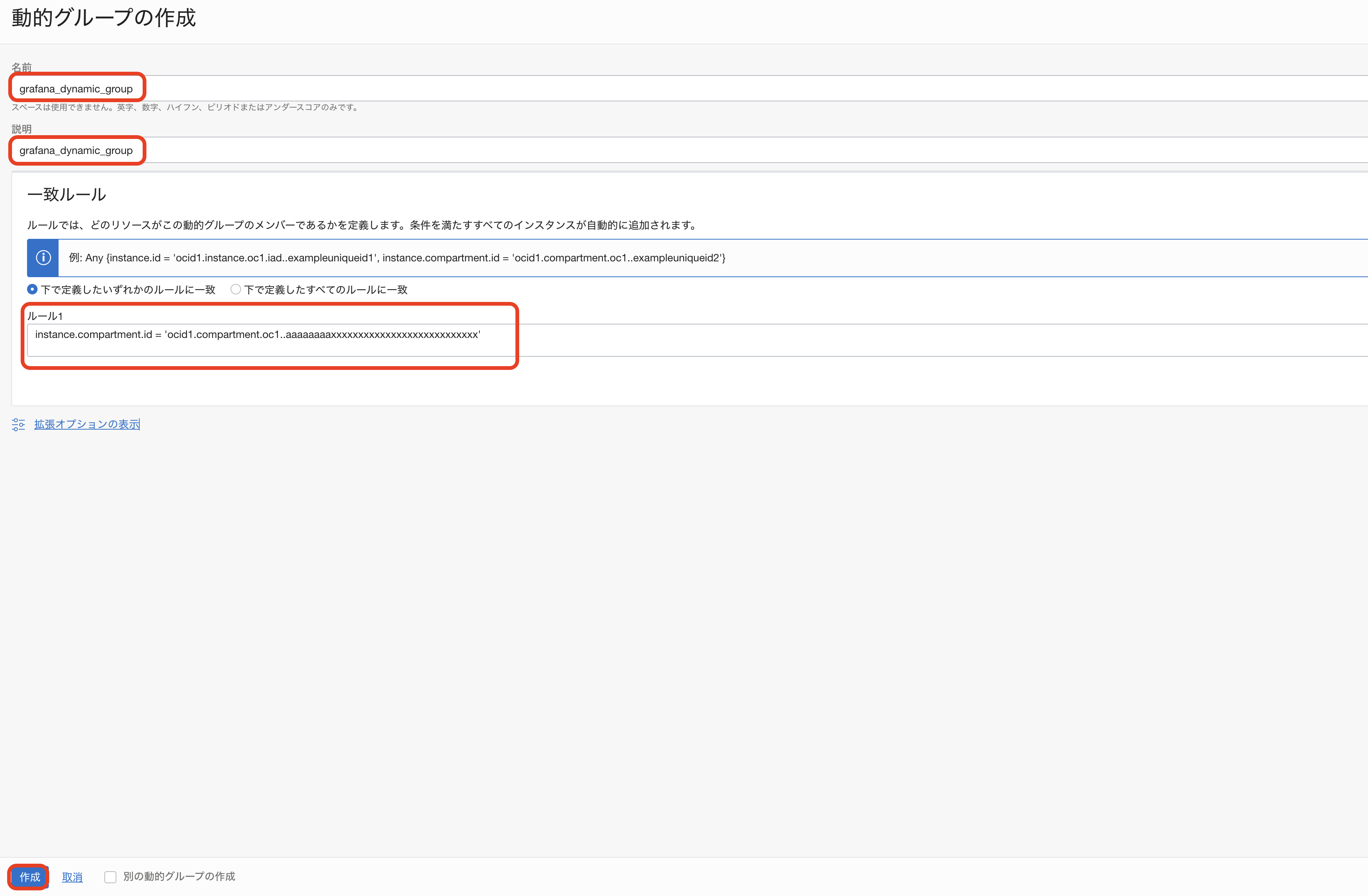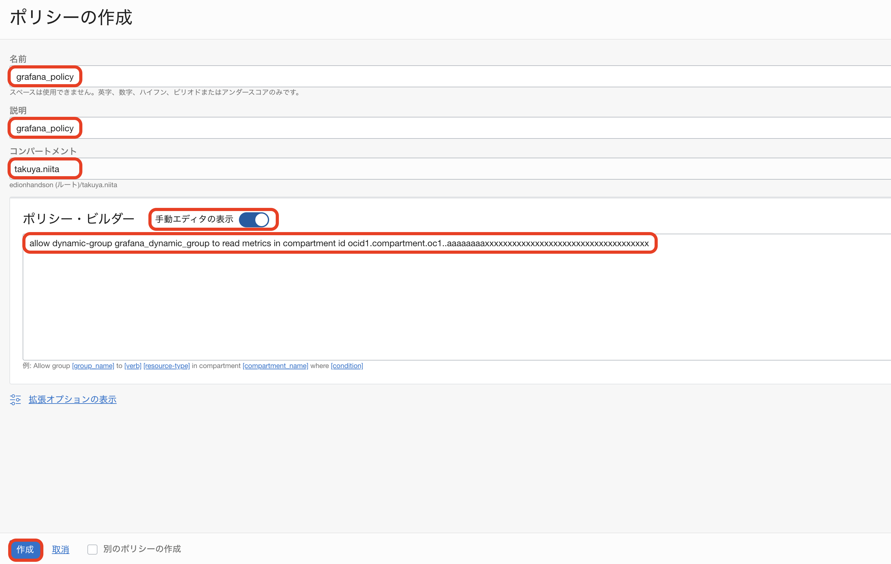 | ポリシー | allow dynamic-group grafana_dynamic_group to read metrics in compartment id <ご自身のコンパートメントOCID> |