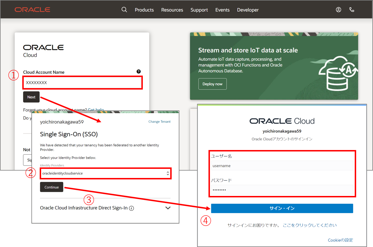 OCIコンソールにブラウザからアクセスします。お持ちのクラウドアカウントを使ってサインインします。