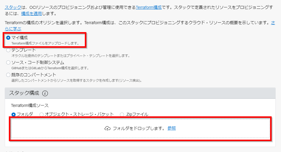 スタックの作成画面で、マイ構成を選択し、.zipファイルをここにドロップします または 参照と表示された領域にダウンロードしたResource Managerアーカイブをドロップし、下部にあるTERRAFORMのバージョンを1.0.xに変更します。
